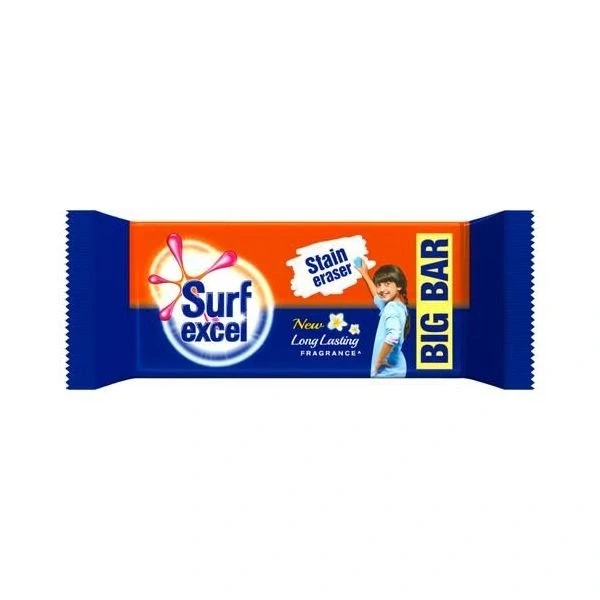 Surf Excel Bar (priced around ₹20 for 145g–150g) is a premium detergent bar designed for tough stain removal, combining the power of vinegar, blue, bleach, and lemon. It effectively removes stubborn stains like curry, tea, and grease while remaining gentle on hands and clothes, serving as a personal stain eraser.