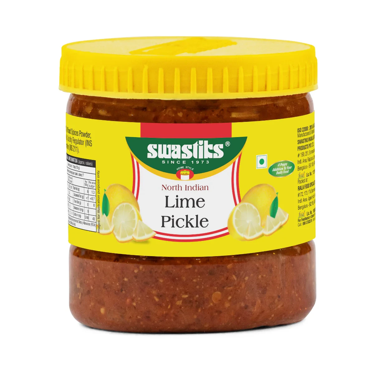 Swastiks Lime Pickle (often available in 100g, 300g, and larger packs) is a popular Indian condiment known for its traditional, homemade taste. It offers a tangy and zesty flavor profile that balances the sourness of lime with a blend of aromatic spices.
