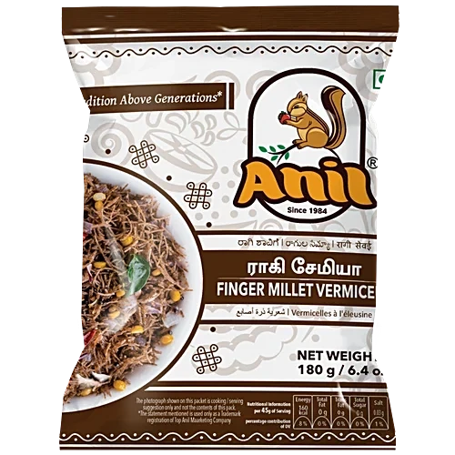 Anil Ragi Vermicelli (180g) is a nutritious, fiber-rich, and healthy alternative to regular wheat vermicelli made from finger millet (ragi). It offers a soft, non-sticky texture, providing a rich, earthy flavor perfect for quick breakfasts or savory snacks like upma and stir-fries. It is high in calcium and iron