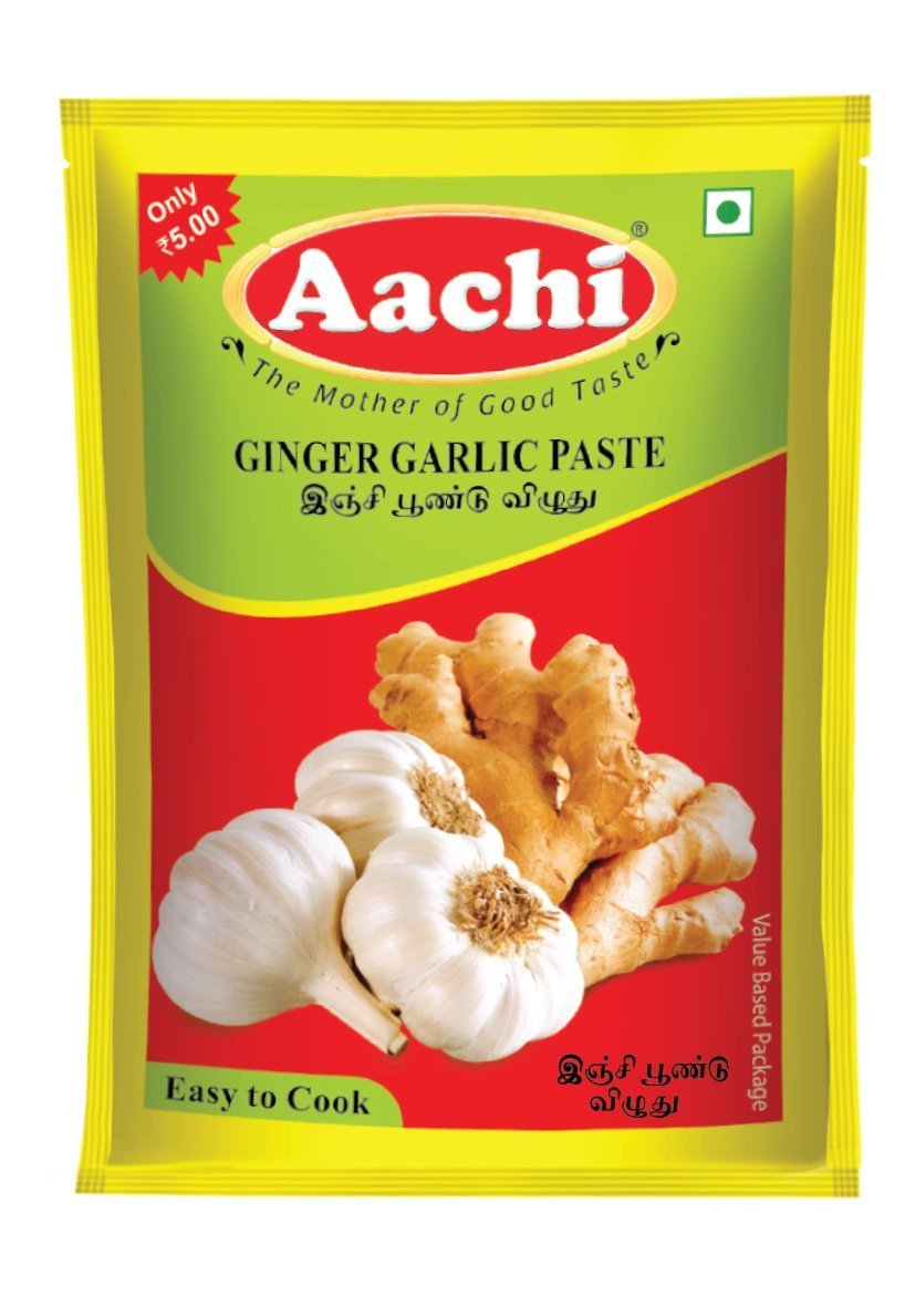 Aachi Ginger Garlic Paste (Rs. 5) is a budget-friendly, ready-to-use cooking paste packaged in a convenient single-use pouch (approx. 30g). It offers a fresh blend of ginger and garlic to enhance curries, marinades, and stir-fries without peeling or grinding, saving time and offering authentic, bold flavor.
