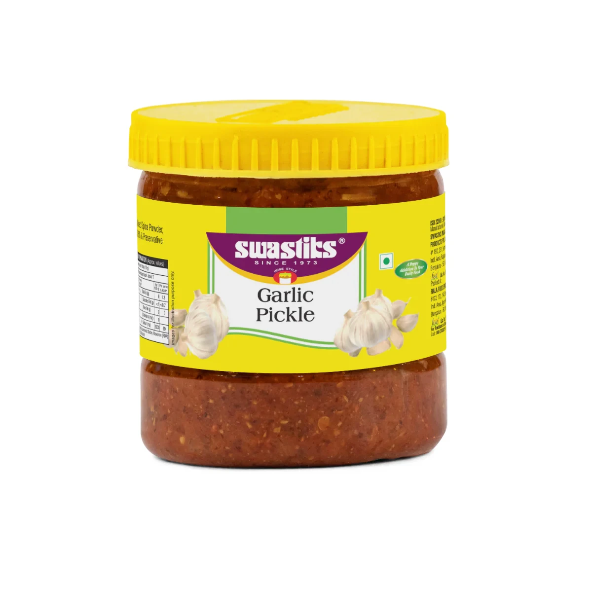Swastiks Garlic Pickle is a bold, spicy, and tangy South Indian condiment made from high-quality whole garlic cloves, blended with traditional spices and oils. It offers an authentic homemade taste with a robust flavor, perfect for pairing with rice, parathas, dosas, and curd rice. It is made without artificial preservatives.